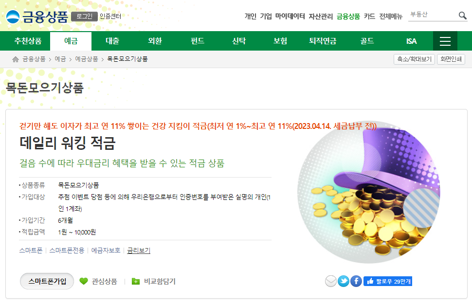 걷기만 해도 이자가 최고 연 11% 우리은행 데일리 워킹적금은 걸음 수에 따라 우대금리 혜택을 받을 수 있는 적금입니다. 스마트폰 전용으로 우리WON뱅킹으로 신규가입이 가능합니다.