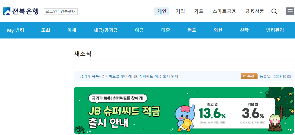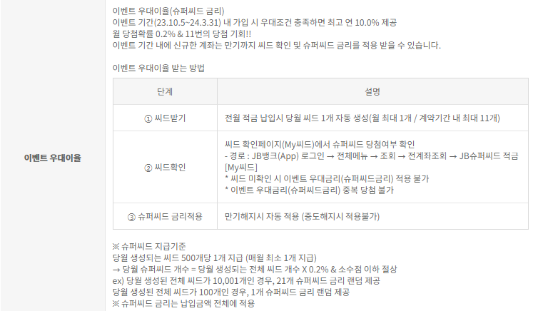 10월 최고금리 연 13.6% JB 슈퍼씨드 적금은 디지털채널 전용 미션 수행으로 추첨형 정기적금 상품입니다.