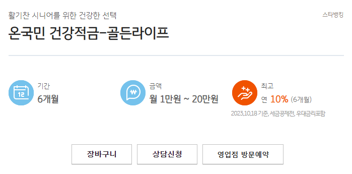 2023년 10월 18일 기준 세전 6개월 KB국민은행 온국민 건강적금 골든라이프 적금은 월 1만원에서 20만원으로 시니어 고객의 건강관리와 금융 혜택을 결합한 앱테크형 상품입니다.